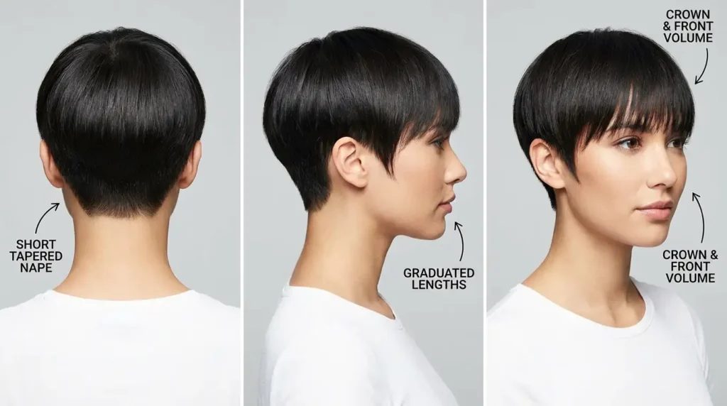 Instead of sharp angles, this pixie hairstyle for straight hair creates a rounded, feminine shape with volume concentrated at the crown. The back is kept very short while the top is layered to create height and softness.