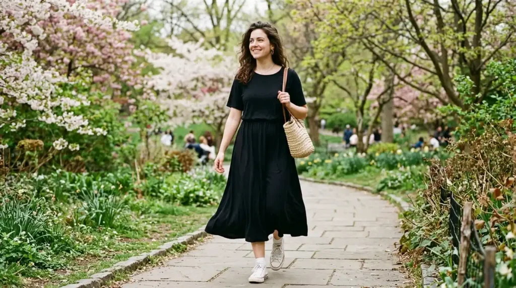 A relaxed black midi dress doesn’t disappear in spring. It evolves. Styled with sneakers it becomes practical, modern, and quietly confident. This is one of those popular spring outfits that feels genuinely timeless without ever feeling boring, which is a harder balance to strike than it looks.