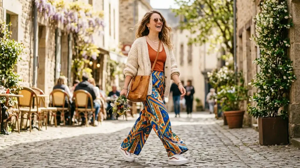 This combination feels very now: cozy textures paired with bold movement. A relaxed cardigan layered over a fitted tank, balanced by printed wide-leg pants, shows how this season’s comfortable spring outfits are leaning into contrast rather than strict coordination. It’s a more interesting approach and a more forgiving one.