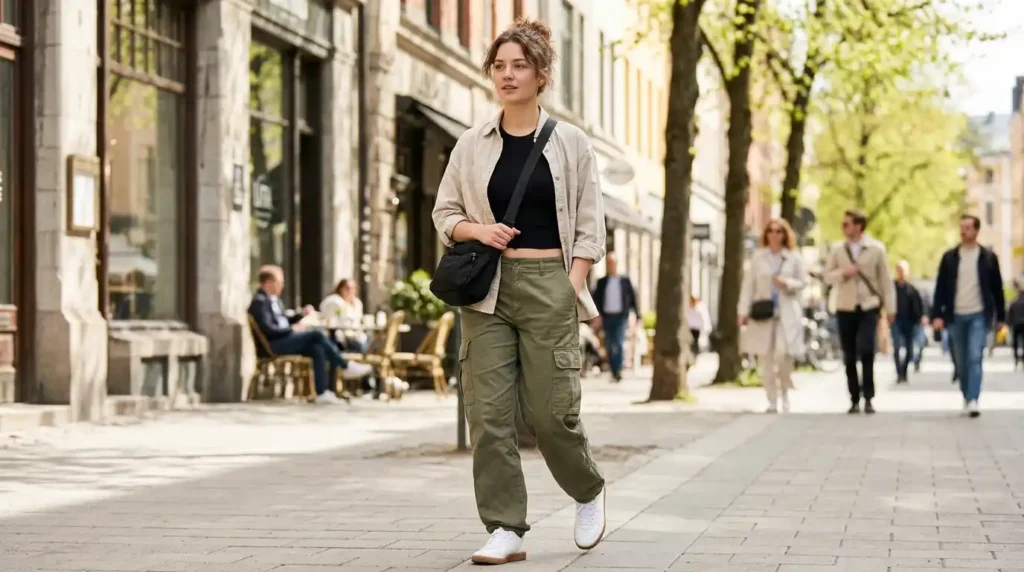 A cropped fitted top keeps proportions sharp. Relaxed cargo-style trousers bring comfort and practicality without sacrificing style. A lightweight overshirt softens the look and adds flexibility for changing temperatures throughout the day. Clean sneakers make it functional without asking you to compromise on how you look.