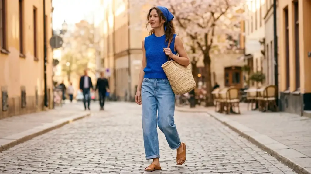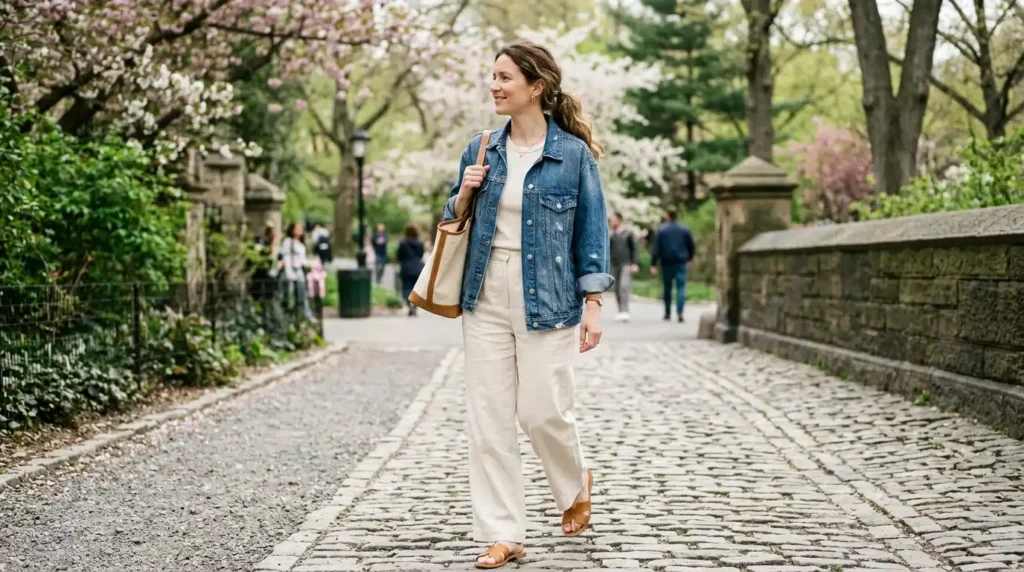 | Calm Denim Layers | Denim jacket, cream trousers, flat sandals | Reliable everyday wear |