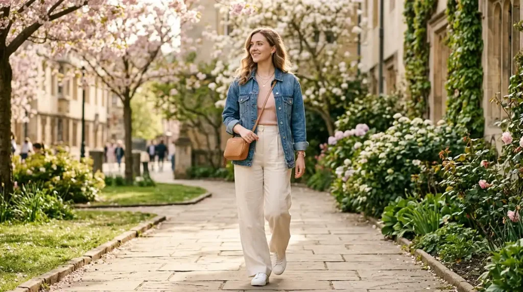 Denim shows up every spring, but this version feels softer and more intentional. A relaxed denim jacket paired with neutral cream trousers captures that understated confidence that defines the best comfy spring outfits 2026. It doesn’t demand attention. It just always looks considered.