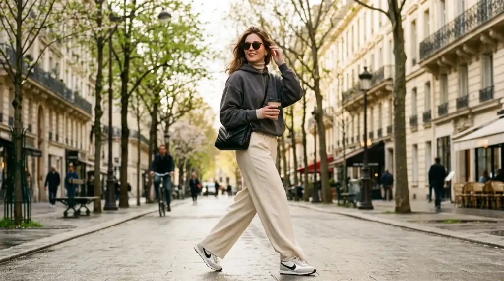 The oversized hoodie brings softness and ease. Light-colored wide-leg trousers elevate the look well beyond gym wear into real everyday spring style territory. Sneakers tie everything together and make it ideal for long city days. Sunglasses add that final intentional touch that separates this from just grabbing a hoodie on the way out.