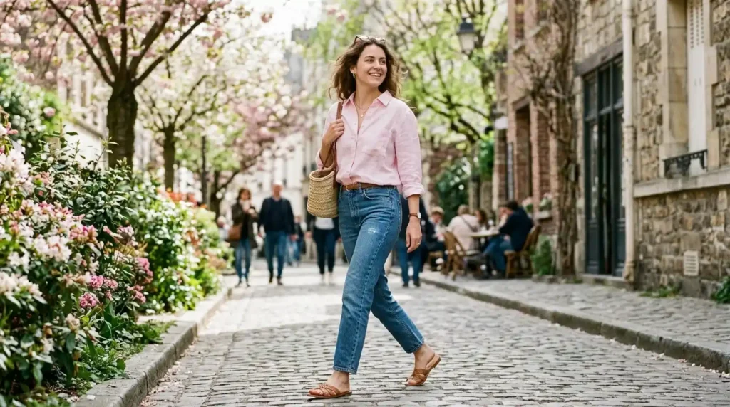 Now here’s the detail that elevates this look: the button-down doesn’t need to be fully buttoned. A few buttons open at the top, or the shirt loosely tucked rather than fully tucked, gives it an effortless quality that styled-to-perfection would remove entirely. Intentional imperfection is part of what makes spring outfits feel alive.