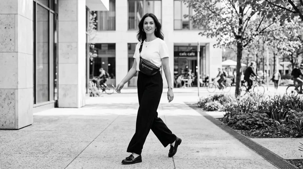 The waist bag adds functionality and a modern edge that a shoulder bag or tote doesn’t quite replicate in this context. Loafers keep the look comfortable and refined at the same time. Accessories stay minimal, letting the silhouette do the talking. Simplicity sharpens style, and this outfit proves it in the most wearable way.