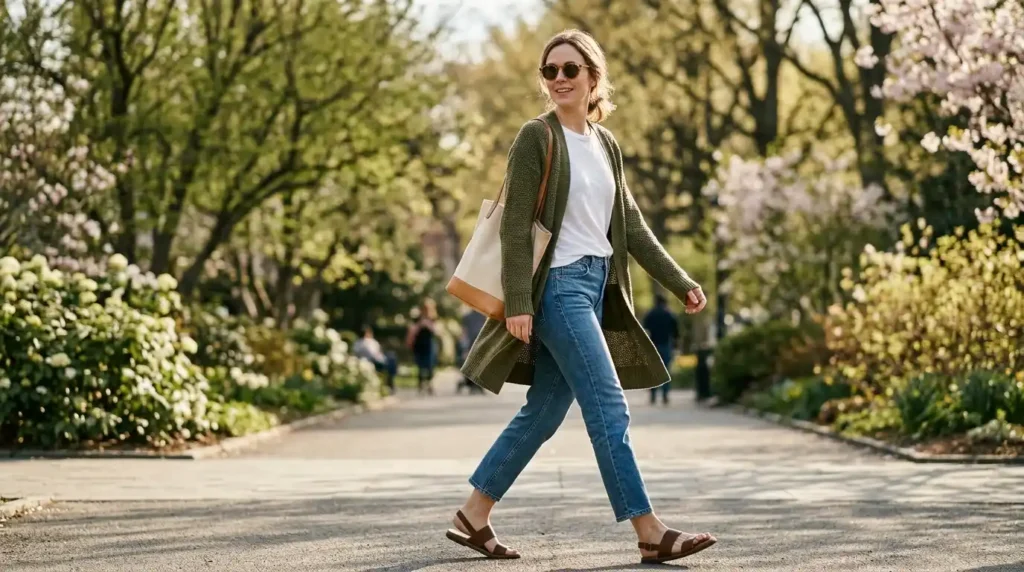 | Easy Layers Long Walks | Cardigan, lightweight top, straight jeans | Crisp spring mornings |