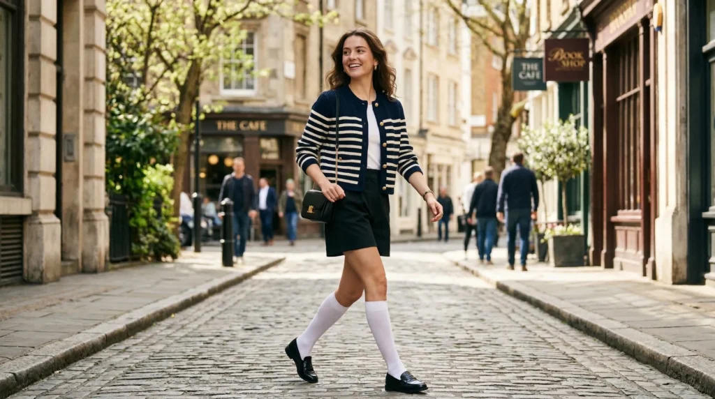 There’s a certain joy in seeing classic stripes styled with confidence. A striped cardigan with gold buttons paired with tailored black shorts feels playful yet rooted in tradition. It’s a youthful take on old money dressing that still respects its origins — very relevant for spring 2026.