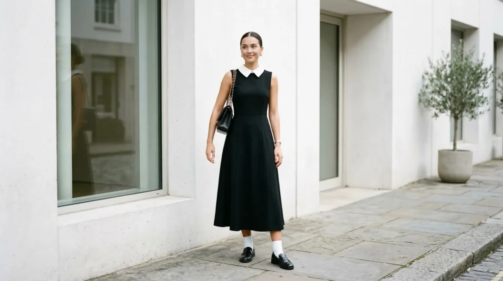 The collar detail does a lot of work. It softens the darkness and brings in that unmistakable preppy reference. Loafers, white socks, and a quilted chain bag reinforce the heritage feel without making it dated. This is the kind of outfit fashion editors call a “quiet power move.”