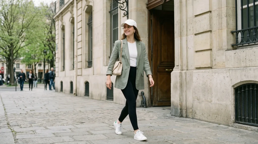 | Soft Tailoring Meets Modern Ease | Muted green blazer, leggings, cap | Everyday errands |