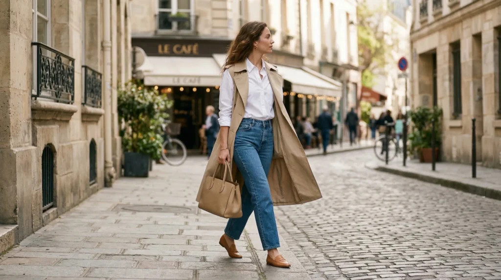 | Timeless Layers: City Spring Mood | White shirt, straight jeans, trench layer | Work-to-lunch |