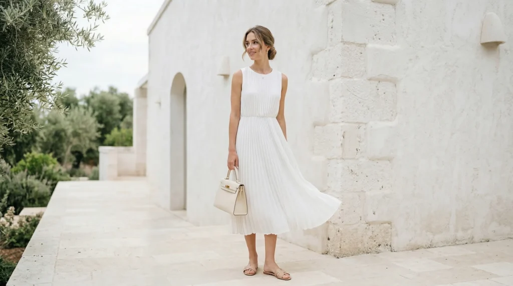 | Minimalism with a Polished Edge | White pleated dress, structured bag | Daytime events |