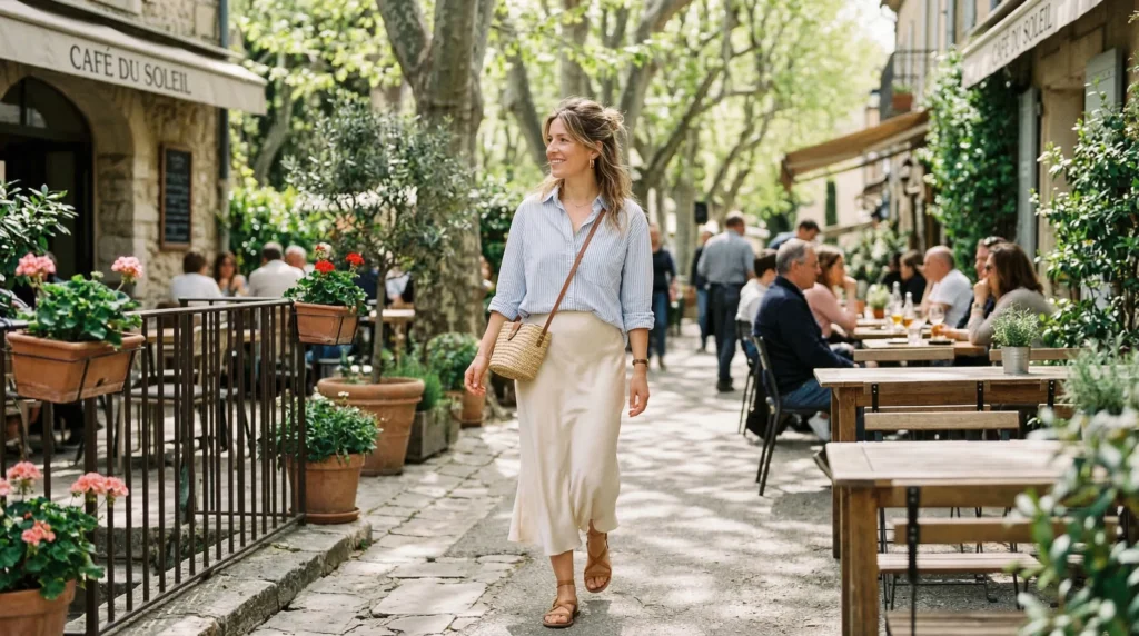 Every element is a staple. The striped shirt is timeless. The skirt adds movement. Neutral accessories keep everything cohesive. Flat sandals and a woven bag lean into that old money ease — nothing flashy, everything considered.