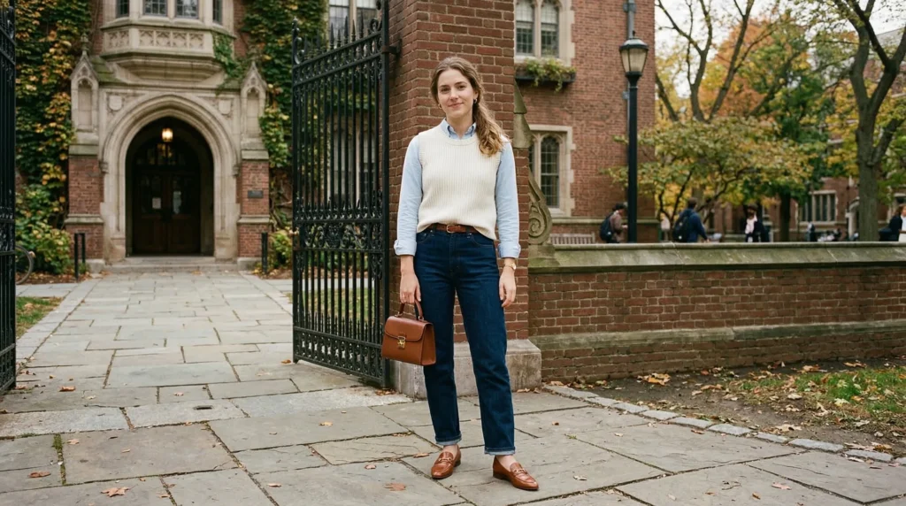 The vest softens the shirt’s structure and adds warmth for unpredictable spring days. Dark jeans keep the look modern and wearable. Pointed leather shoes and a structured handbag bring a subtle sense of heritage. Accessories stay minimal, which feels very aligned with where preppy old money style is heading — less display, more discretion.