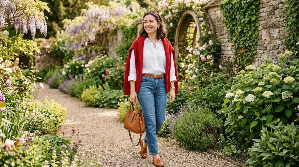 | Classic Prep with a Pop of Color | White shirt, denim, red cardigan | Bright spring days |