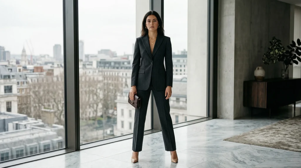 | Modern Heritage: Tailored Precision | Pinstripe blazer set, pointed heels | Meetings & events |
