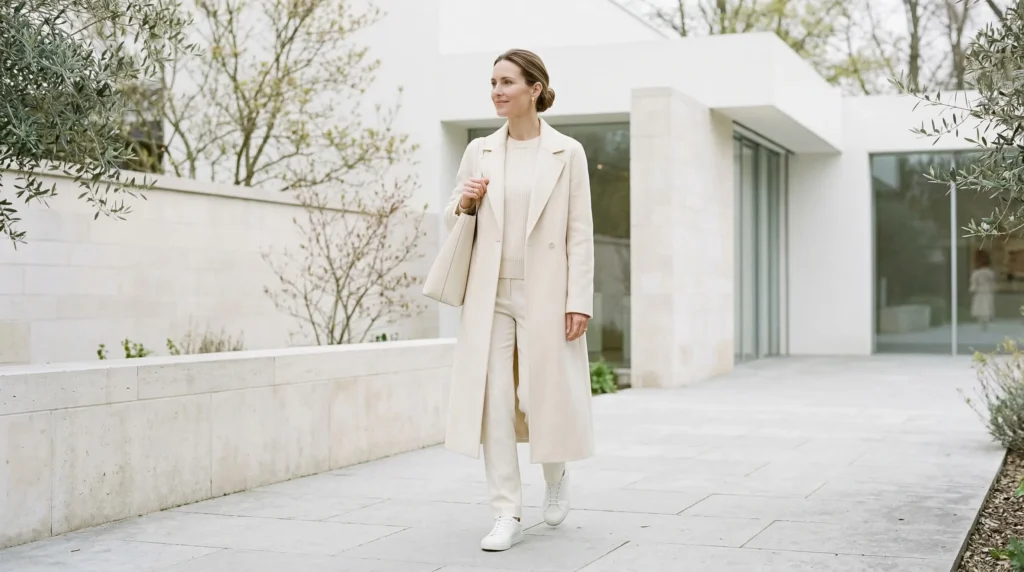 | Quiet Luxury in Monochrome Layers | All-cream coat, knit, trousers | Elevated weekdays |