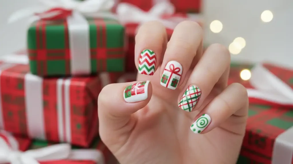 White base nails with different wrapping paper patterns on each finger – chevrons, ribbons, presents.