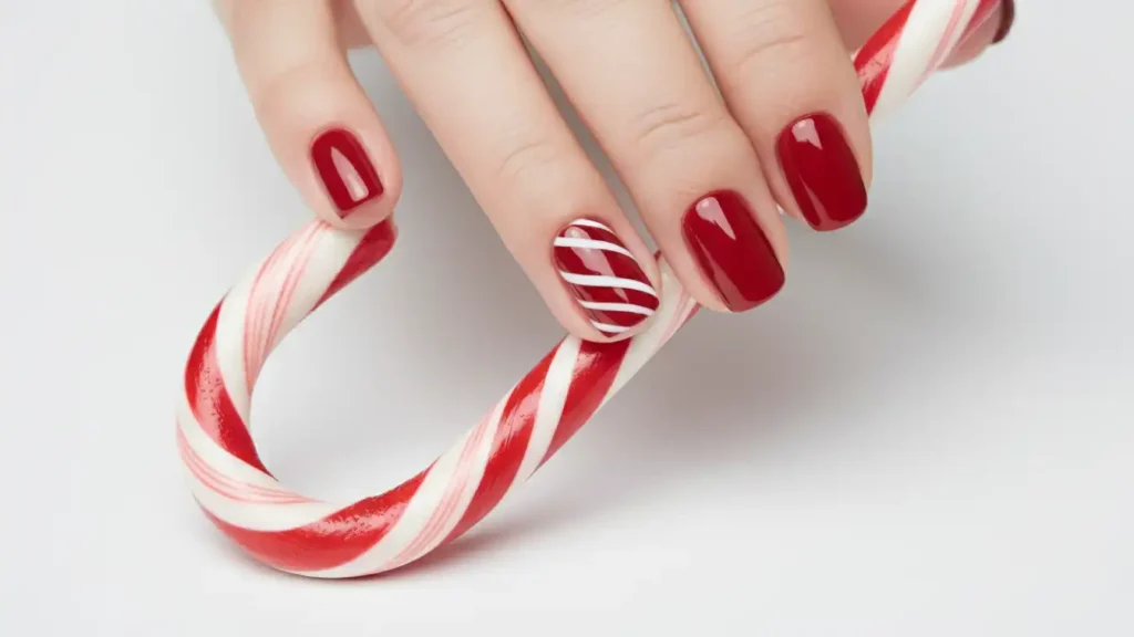 Deep red nails with one or two accent nails featuring classic candy cane diagonal stripes.
