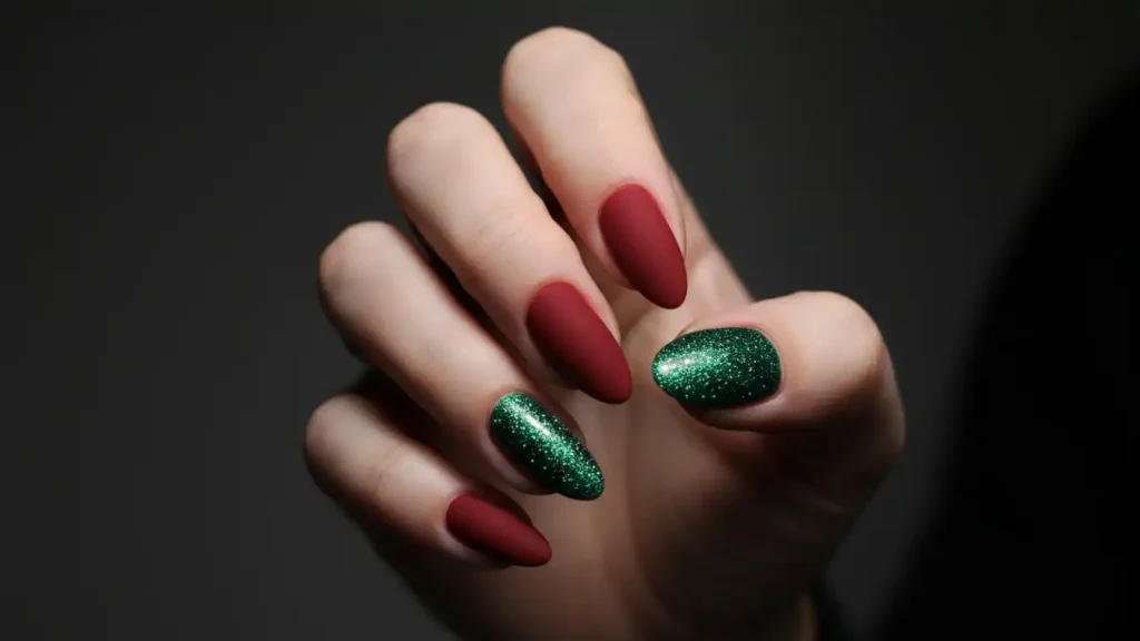 Matte deep red nails with one or two green glitter accent nails for contrast.
