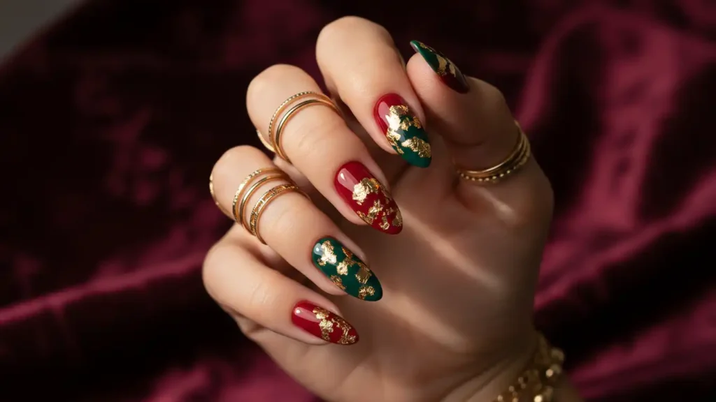 Classic red and green nails with irregular gold foil pieces pressed on top.