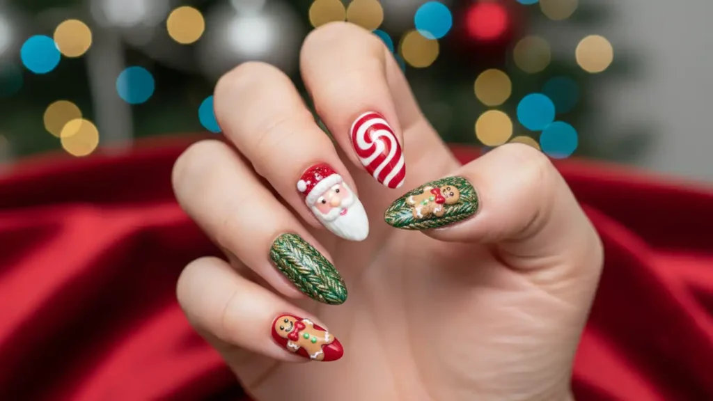 Every single nail tells a different Christmas story – snowman, Santa, candy canes, cable knit texture.