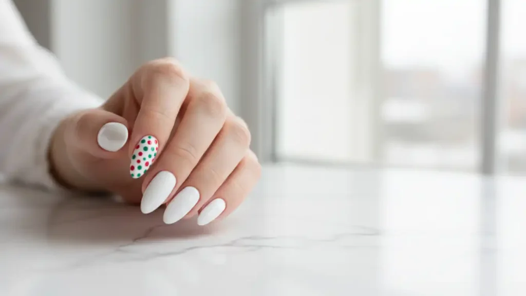Crisp white nails with one accent nail covered in random red and green dots.