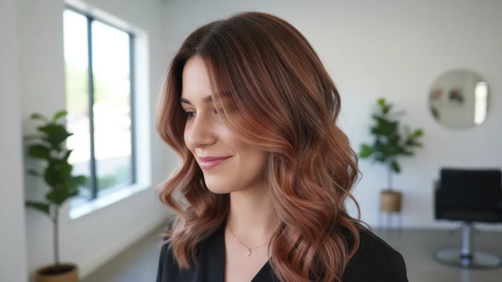 This is where red highlights meet the rose gold trend, and honestly? It’s a match made in heaven. The rose gold red has these beautiful copper undertones that warm up your brunette hair while adding a trendy twist.