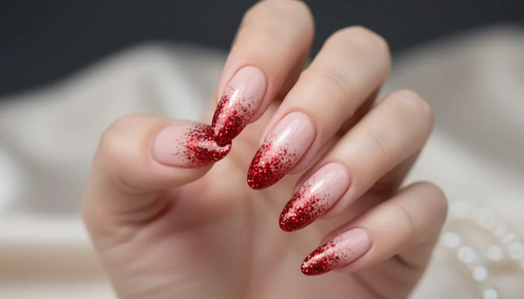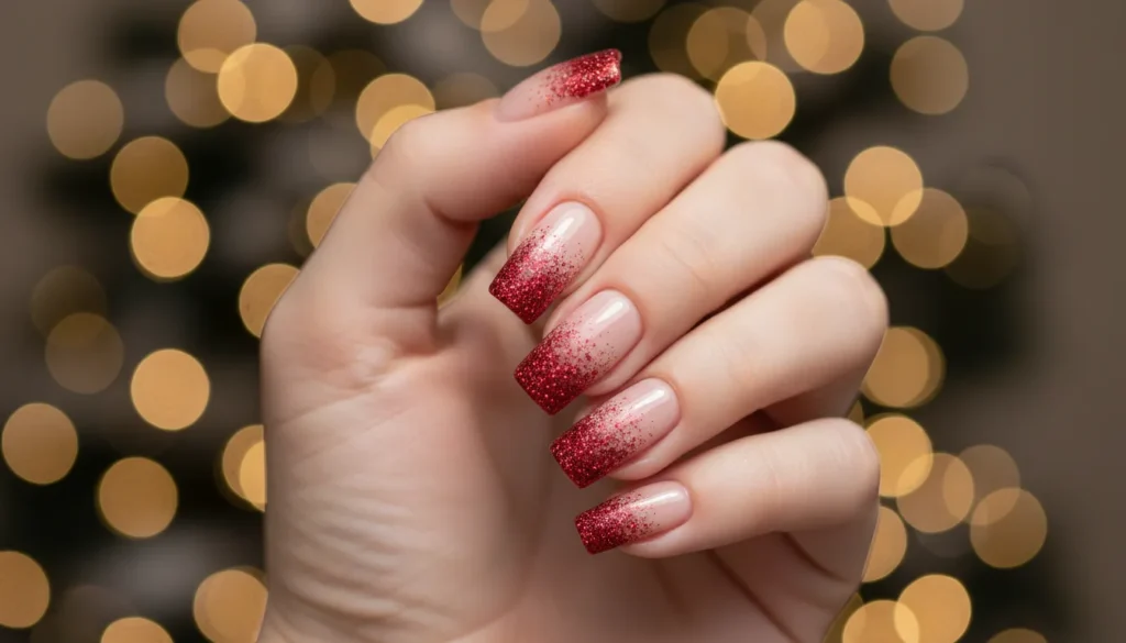A sheer nude base fading into sparkling red tips feels festive but refined. The glitter is concentrated at the ends, so the ombrรฉ stays soft and balanced.