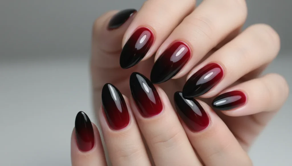For parties/nights out: Bold red to black gradients on long nails with high-gloss finish. Statement red ombre nails that match your energy.