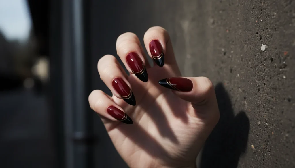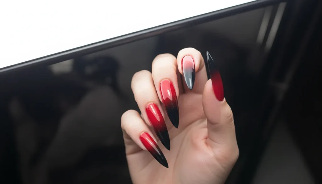 Bright red melting into almost-black tips creates dramatic contrast that’s impossible to ignore. The stiletto shape sharpens the gradient and makes the color difference stand out even more.