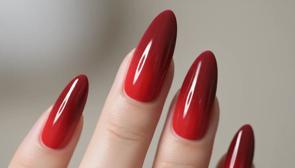 A smooth red gradient deepening toward the tips creates a clean, luxurious finish that’s absolutely gorgeous. The almond shape keeps the look soft while still feeling polished.