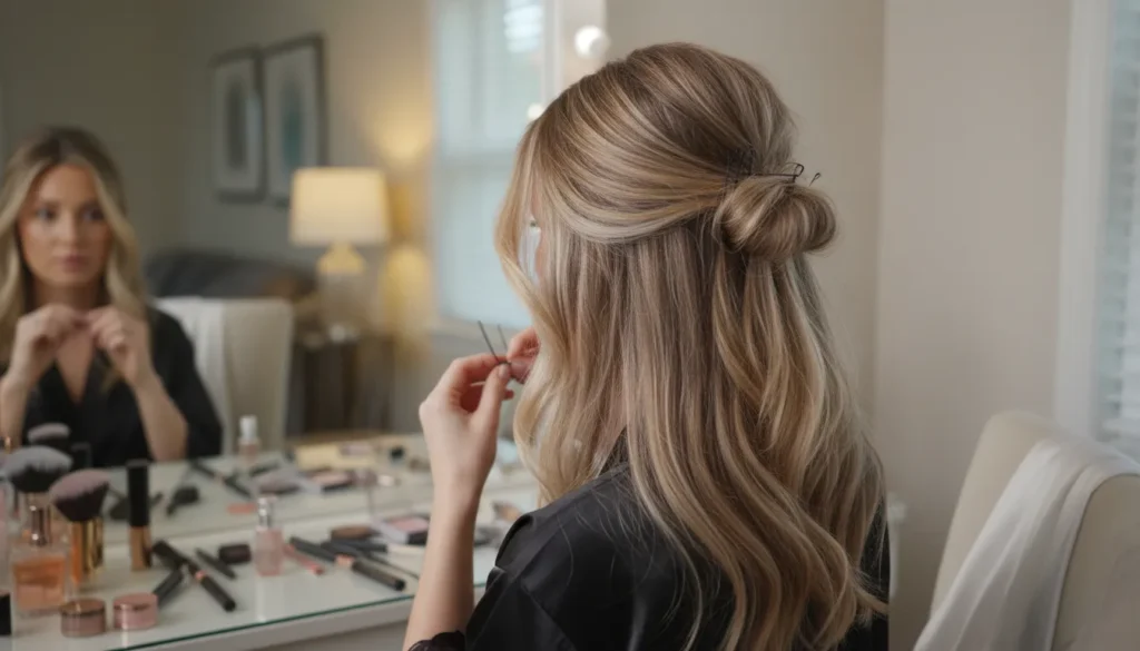Another half-up variation, but this time focusing on how the sandy blonde hair ideas shine when pulled back at the crown. The blended tones create a really natural transition from roots to ends.