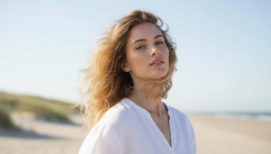 The loose waves mirror actual beach hair — slightly messy, totally gorgeous. It’s understated but still makes an impact in the best way.
