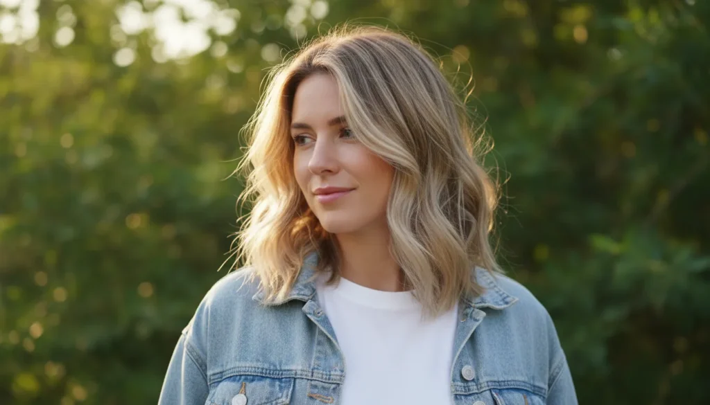 The relaxed waves keep everything feeling easygoing — no perfect curls required. This is the kind of blonde that makes people ask, “Is that your natural color?”