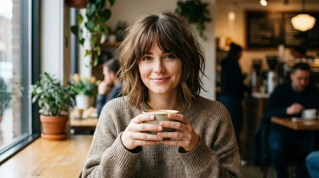 Soft bangs sweep across the forehead, gently framing your face without weighing things down. The tousled texture means you can literally wake up, shake your hair out, maybe add some texturizing spray, and you’re good to go. It radiates that carefree, chic energy that everyone wants but few haircuts actually deliver.