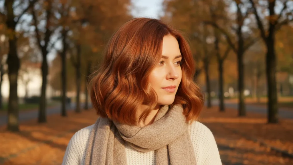 The copper bob catches light beautifully, especially during that magical golden hour we get in October. It’s warm without being overly red, making it flattering on a wide range of skin tones. If you’ve been wanting to go lighter but don’t want to commit to blonde, this is your answer.