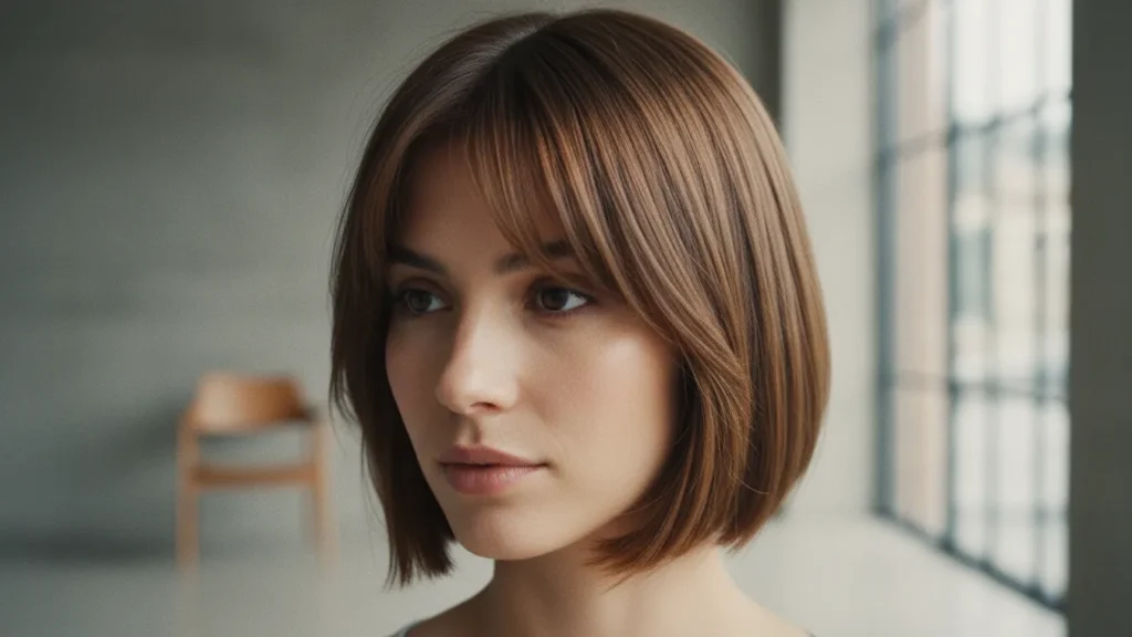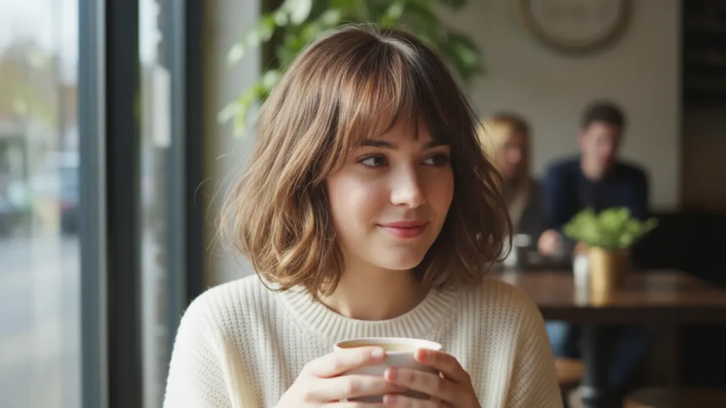 The curtain bangs frame your face beautifully while the bob keeps everything feeling modern and fresh. It’s the kind of haircut that makes you look polished even when you’re just running errands in your weekend sweats.