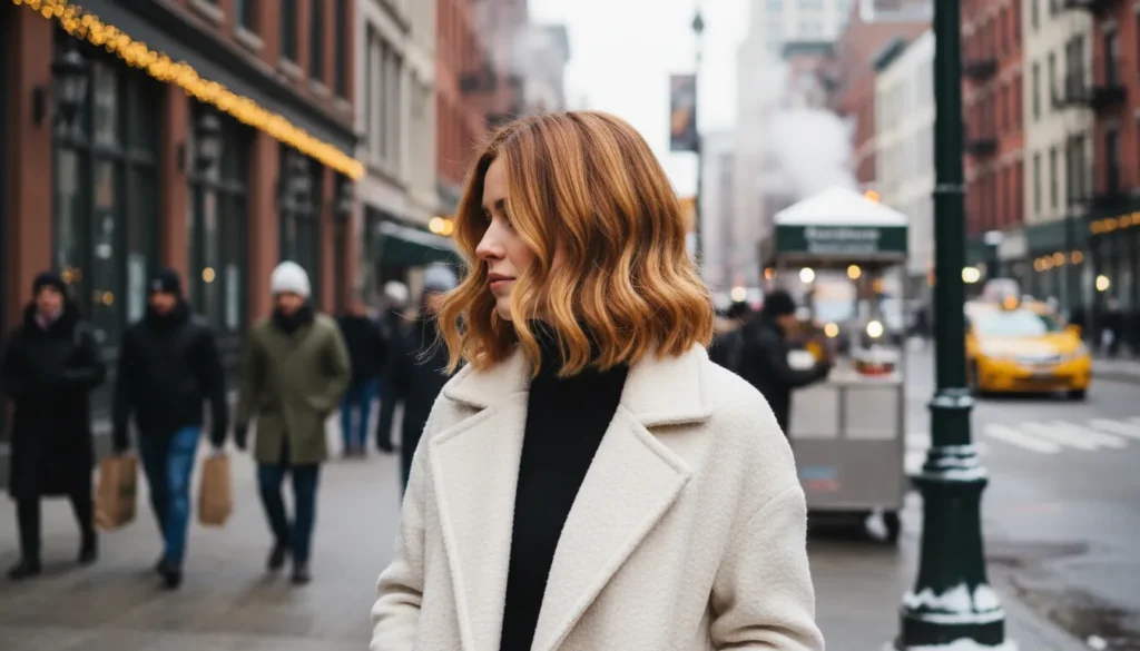 It’s the kind of short winter hairstyle that works for city strolls and dinner dates equally well. There’s a warmth to it — literally in the color, but also in the overall feel — that suits the season perfectly.