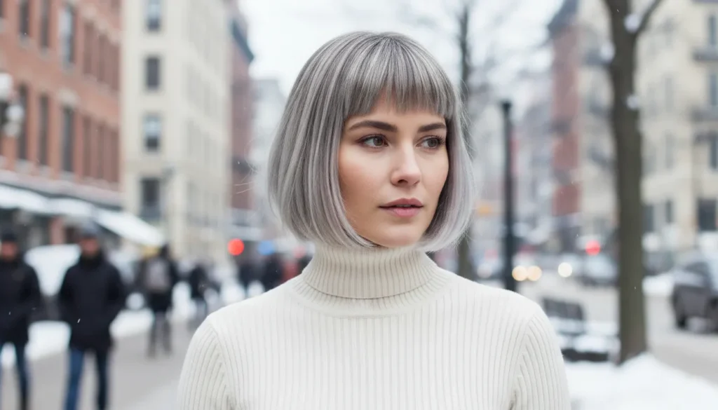 The ash-blonde gradient makes it wearable rather than severe. But make no mistake — this is a statement short bob haircut for winter 2025–2026. Pair it with a turtleneck and a strong coat and the whole look comes together in about thirty seconds.