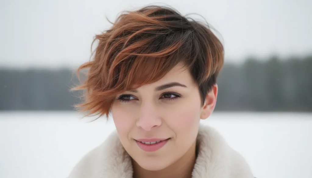 The textured pixie with copper highlights is one of those cuts that immediately draws attention to your best features — eyes, cheekbones, the line of your jaw. The feathered layers add movement, and the copper tones bring warmth and brightness that’s genuinely stunning against winter skin.