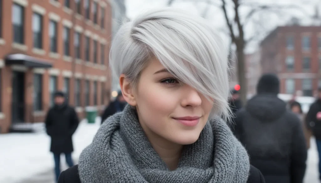 You might be wondering if an asymmetric pixie is too much. It isn’t. The asymmetric platinum pixie — short in the back, longer sweeping fringe in the front — is one of the most striking short haircut trends of winter 2025–2026. It’s dramatic without being costume-y, and the platinum color gives it that fashion-forward sharpness.