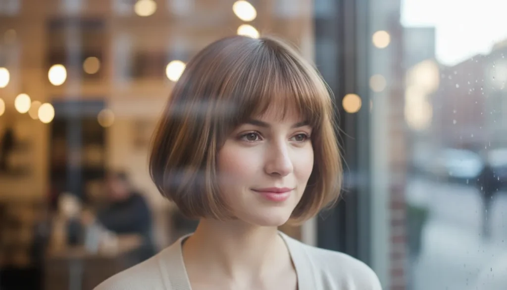 If there’s a short bob haircut for winter 2025–2026 that feels almost universally flattering, it’s the French bob with wispy bangs. The rounded shape softens everything — jaw, cheekbones, the overall impression — while the light bangs add that Parisian nonchalance that never goes out of style.