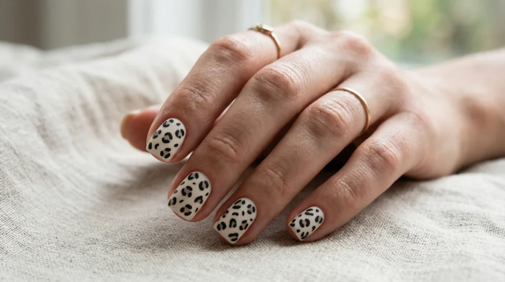 Now here’s where it gets interesting. Animal print nail art sounds like a commitment, but this version is anything but overwhelming. Small, irregular black spots sit on a soft ivory or off-white base. It’s the kind of design that says bold personality without shouting.