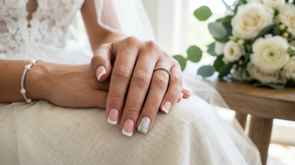 The French tip nail isn’t going anywhere. It’s just getting a serious glow-up. This version uses a sheer pink base with crisp white tips, with one accent nail in rose pink glitter for a modern update. It’s bridal without being too precious.