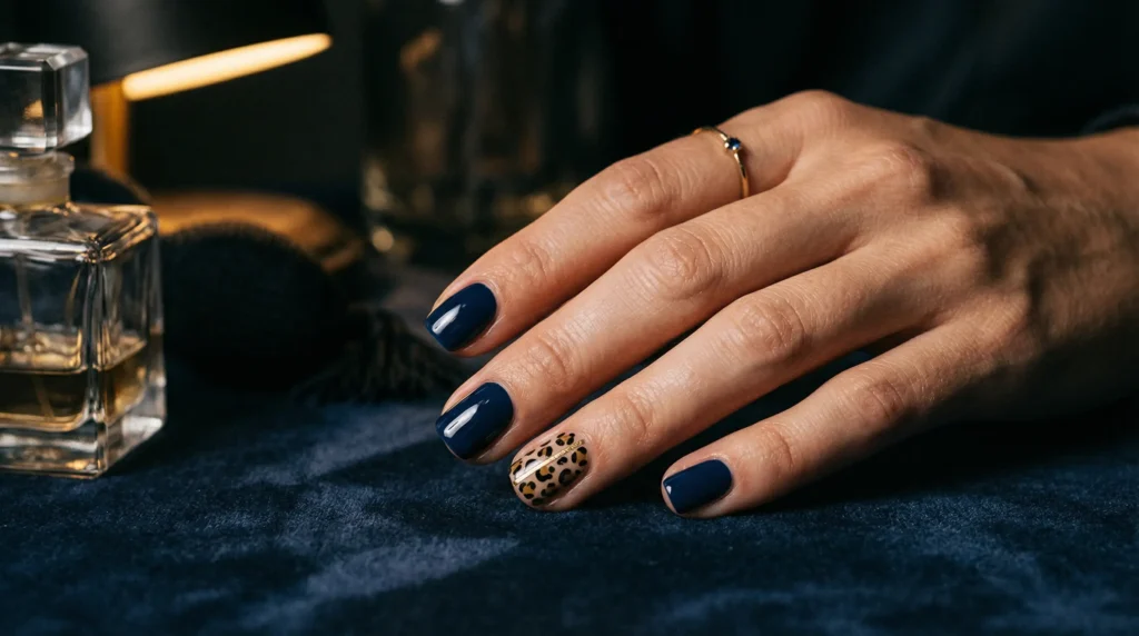 Try OPI Russian Navy or Zoya Ryan for the solid nails. A dotting tool and a dark blue gel on a nude base handles the leopard art. Add gold nail tape or gel striping for that clean diagonal line.
