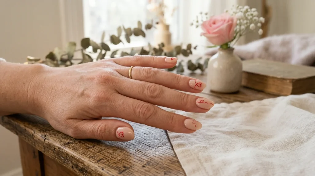 Here’s a design that doesn’t have to wait for February. Heart nail art with alternating single hearts, double outlines, and abstract rounded lines on a nude-pink base. The red pops against the soft base and the short square shape keeps everything balanced.