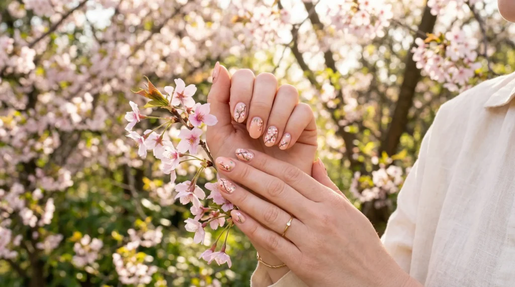 We’re ending on something fresh. A peachy-coral base with two nails featuring hand-painted cherry blossom nail art in pale pink and white. It’s whimsical without tipping into cartoonish. Think: latte on a balcony in March.