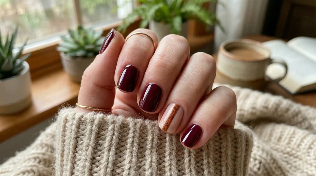 There’s something about deep burgundy nail polish paired with metallic copper that feels genuinely expensive. Four nails in a rich, dark wine tone, two accent nails with diagonal copper swoops on a soft lavender-white base. It sounds complex but it looks completely cohesive.