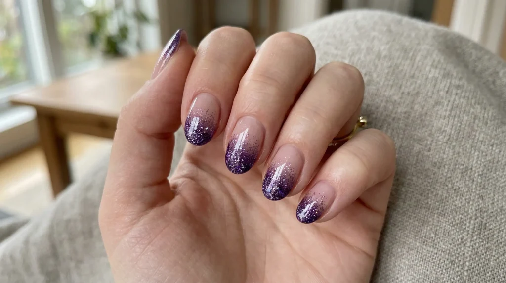 Here’s a truth about glitter ombre nails: it’s all about placement, not quantity. This design uses a sheer nude-pink base and fades purple and lilac glitter toward the tips using a makeup sponge. The result is a soft, hazy sparkle that looks intentional rather than messy.