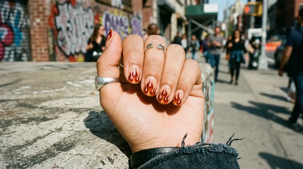 Flame nails are officially back and they’re better than ever. This version puts bright orange and red flame nail art on a clear nude base, so the flames appear to flicker right from the nail itself. It’s part festival-ready, part biker-cool, and 100 percent confident.